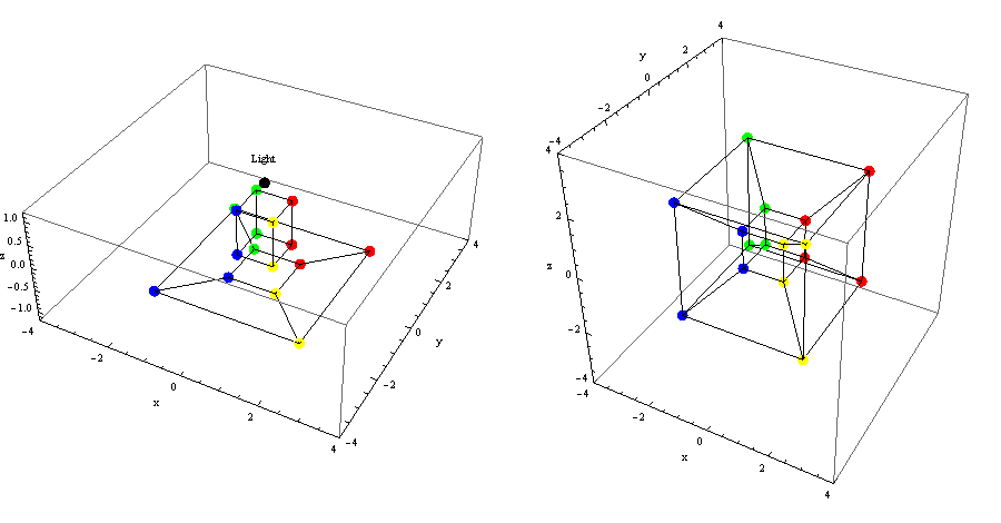 On the right we see the image of a 4-d cube projected onto a 3-d three-space