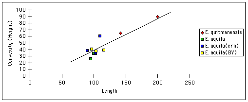 Exogyra aquila is thought to be the oldest exogyra oyster and is found in the Cow Creek and Hensell formations in Central Texas. Exogyra quitmanensis is a very similar fossil of the same age found in the Quitman formation of West Texas. Upon examining the literature I found it quite difficult to see any differences between these two species. The E. quitmanensis are thought to be larger and have greater convexity. Upon examination of the fossils from the Cow Creek formation in the University of Texas Geological repository I found that all specimens were identified as E. quitmanensis, although this was never published, to my knowledge. To address the question of the differences between the two species I have collected data from as many sources in the literature as I could find and using specimens collected by myself and B. Yurke have made the following plots. One might conclude from the plots that these two species should really be joined into a single species. In that case, the name E. aquila should be reserved for the European species and E. quitmanensis for the Texas species. Final determination of this question should wait until additional specimens can be collected from the quitman formation.