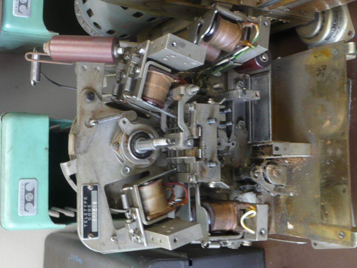 Bug 52: On Oct 13 we noted that the Teletype was producing a glitch on the data line at the end of the stop bits. The Teletype keyboard produces parallel data; this data is converted to serial form by a distributor in the right rear of the typing unit. This has a carbon brush that sweeps around electrical contacts for each bit of data. We hypothesized that the glitch was caused by the distributor stopping precariously close to the end of the contact area for the stop bit, briefly breaking the connection.