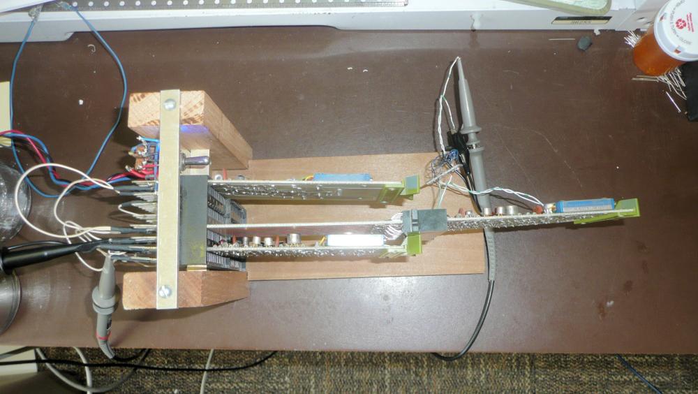 We built the test rig shown here to compare boards A and I. It is basically the same rig we used on July 3, but with two G007 boards at the bottom in the photo linked to the G008 Master Slice Control at the top in the photo. One G007 is on an extender so the foil sides of both boards are accessible, and we used our 3-winding pulse transformer to connect the signal generator on the scope to the two sense amplifier inputs. We checked to make sure that the transformer windings were indeed giving identical outputs by switching which winding fed which sense amplifier.
