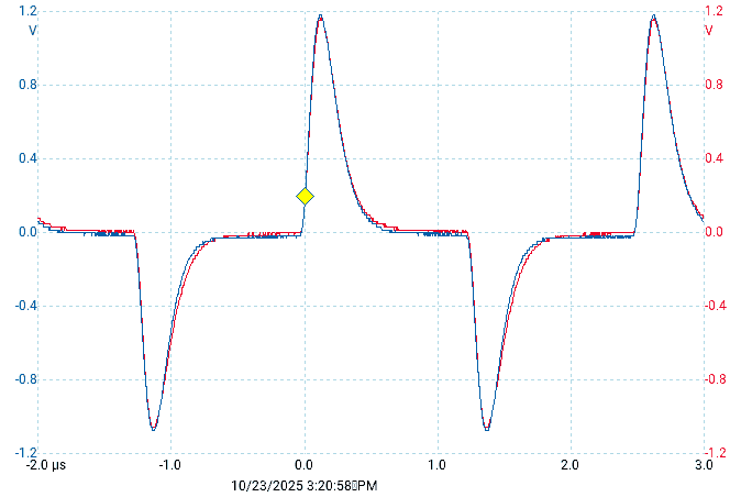 With our test rig producing clean 20mV spikes as input, the collectors of Q5 produce complementary and somewhat stretched spikes with an amplitude close to 0.25V. At first glance, it is very difficult to see any difference between the good board and the problem board. Note that the complementary outputs were recorded separately and then combined here. Small horizontal differences between the two red traces are the result of jitter in the signal generator output and not evidence of amplifier problems.