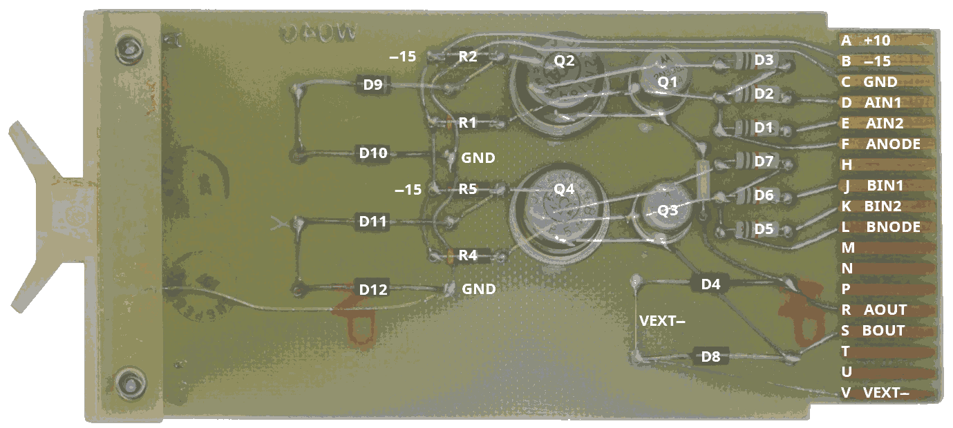 This led us to pull the R220 3-bit shift register board from backplane slot MF22. Even though we had just tested all the diodes, careful testing revealed that 3 more diodes on this board were bad. We suspect that the nearly random placement of diodes on this very crowded board led us to miss some of the bad diodes.