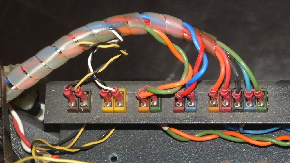 Moving the wire between the Type 834 panel and the Type 704 supply involved cutting off the ring-lugs that formerly terminated it to the input circuit breaker and replacing them with Faston connectors. We left the full length of this wire intact, so it can be swung over to the faston connectors on the input side of the Type 834 panel if someone wants to restore the machine to the "as used but unsafe" wiring that we have changed.