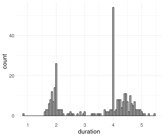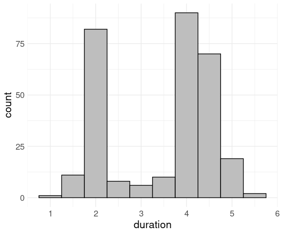 A histogram of eruption durations for another data set on Old Faithful eruptions, this one from package MASS: