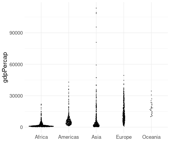 p <- ggplot(gapminder, aes(y = continent, x = lifeExp))