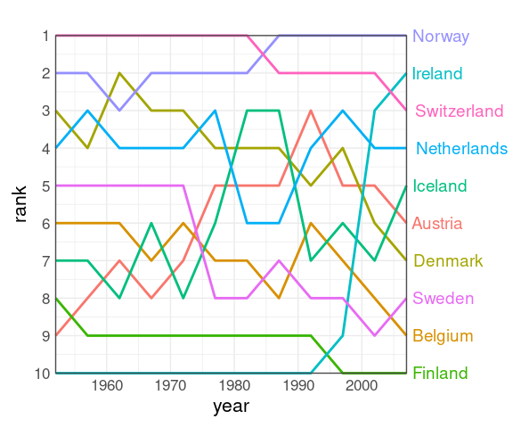 The ggbump package provides geom_bump for drawing smooth bump chart lines: