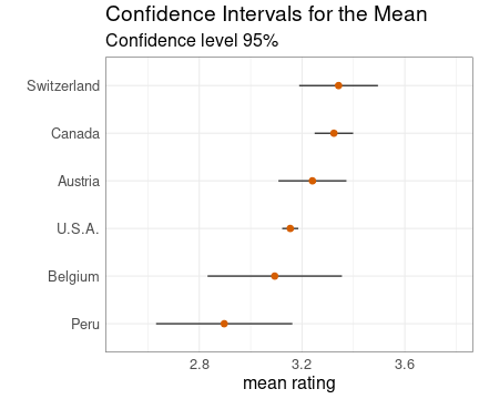 class: center, middle, title-slide .title[ # Final Notes ] .author[ ### Luke Tierney ] .institute[ ### University of Iowa ] .date[ ### 2025-05-08 ] --- <link rel="stylesheet" href="stat4580.css" type="text/css" /> <style type="text/css"> .remark-code { font-size: 85%; } </style> ## Some Other Topics Some topics we did not have time to look at: -- * Working with models ([Chapter 6 in Healy, 2018](https://socviz.co/modeling.html); [Tidy Modeling with R](https://www.tmwr.org/)). -- * [Visualizing missing values](http://naniar.njtierney.com/articles/naniar-visualisation.html). -- * Visualizing uncertainty ([Chapter 16 of Wilke, 2019](https://clauswilke.com/dataviz/visualizing-uncertainty.html) and [below](#visualizing-uncertainty)) -- * Plot annotation, plot ensembles, and dashboards. ([Part II of Wilke, 2019](https://clauswilke.com/dataviz/proportional-ink.html); [Chapter 5 of Healy, 2018](https://socviz.co/workgeoms.html); [below](#plot-annotation-plot-ensembles-and-dashboards)). -- * Data Science Ethics ([below](#data-science-ethics)). --- layout: true ## Visualizing Uncertainty: Hurricanes --- name: visualizing-uncertainty All estimates from data are associated with some degree of uncertainty. -- Effectively communicating that uncertainty in visualizations is challenging and an active area of [research](http://space.ucmerced.edu/chapter). -- The _cone of uncertainty_: (From Cairo (2019); images from a [blog post](https://web.archive.org/web/20231202192241/http://www.thefunctionalart.com/2020/01/all-graphics-from-how-charts-lie-freely.html) by the author.) <!-- https://www.dropbox.com/sh/d1kb0jdrhkb43j9/AADTBfRvAh-mxmSxBRNZpLJja/5.CHAPTER5?dl=0&preview=PDF10.Tropicalstorm.pdf&subfolder_nav_tracking=1 --> .pull-left[ <img src="../img/PDF10.Tropicalstorm.png" width="450" /> ] -- .pull-right[ The [NHC forecast cone](https://www.nhc.noaa.gov/aboutcone.shtml) is designed so that two-thirds of historical official forecast errors over a 5-year sample fall within the cone for a particular time point.. ] --- When published in the media these visualizations are routinely misinterpreted something like this: <!-- https://www.dropbox.com/sh/d1kb0jdrhkb43j9/AADTBfRvAh-mxmSxBRNZpLJja/5.CHAPTER5?dl=0&preview=PDF11.StormWRONGSize.pdf&subfolder_nav_tracking=1 --> .pull-left.width-65[ <img src="../img/PDF11.StormWRONGSize.png" width="573" /> ] --- A more effective representation might be something like this, showing an _ensemble_ of possible tracks: <!-- https://www.dropbox.com/sh/d1kb0jdrhkb43j9/AADTBfRvAh-mxmSxBRNZpLJja/5.CHAPTER5?dl=0&preview=PDF13.StormLines.pdf&subfolder_nav_tracking=1 --> .pull-left.width-65[ <img src="../img/PDF13.StormLines.png" width="573" /> ] -- .pull-right.width-30[ An animated version may be more effective, if the presentation medium permits. {{content}} ] -- Developing better visualizations for hurricane forecasting, especially targeting the public, is an active area of research. --- layout: true ## Visualizing Uncertainty: Chocolate Bars --- .pull-left[ [Expert ratings](http://flavorsofcacao.com), on a scale from 0 to 5, for chocolate bars manufactured in several countries: ] .pull-right[ <!-- --> ] --- .pull-left[ The standard deviations of the data distributions are comparable, but the lengths of confidence intervals for the mean vary because of the different sample sizes: ] .pull-right[ <!-- --> ] --- .pull-left[ The same plot with a reduced horizontal range: ] .pull-right[ <!-- --> ] --- .pull-left[ A more elaborate display with confidence intervals at several levels: ] .pull-right[ <!-- --> ] --- .pull-left[ Confidence densities, or confidence distributions, as proposed in > Adrian W. Bowman. Graphics for Uncertainty. J. R. Statist. Soc. A > 182:1-16, 2018. [Link](https://rss.onlinelibrary.wiley.com/doi/full/10.1111/rssa.12379) ] .pull-right[ <!-- --> ] --- One drawback of all of these methods: -- > The least precise measurement draws the most attention. -- These examples from Wilke's book use the [`ungeviz` package](https://github.com/wilkelab/ungeviz) available on GitHub. -- Another package providing some tools for uncertainty visualization is [`ggdist` package](https://mjskay.github.io/ggdist/). --- layout: true ## Visualizing Uncertainty: Old Cars --- Using the very old `mtcars` data set to illustrate estimating a smooth relationship: -- .pull-left[ <!-- --> ] -- .pull-right[ A default `geom_smooth` shows an estimate along with a point-wise confidence band. {{content}} ] -- This may not give the best sense of the joint uncertainty: if the curve is higher on some places it may need to be lower in others. --- Showing an _ensemble_ of curves that all are plausible can be a better choice. -- .pull-left[ <!-- --> ] -- .pull-right[ This approach was shown earlier for visualizing possible hurricane paths. {{content}} ] -- This ensemble is generated using a _case-based bootstrap_. {{content}} -- These plots are called _ensemble plots_ (also spaghetti plots, for obvious reasons). --- If animation is available, an alternative is to show the curves one at a time in an animation. -- .pull-left[ <!-- --> ] -- .pull-right[ Again, a bootstrap is used to produce the estimates. {{content}} ] -- This is an example of a _hypothetical outcomes plot_, or _HOP_, as introduced in > Hullman, Jessica, Paul Resnick, and Eytan Adar. "Hypothetical > outcome plots outperform error bars and violin plots for inferences > about reliability of variable ordering." PLOS ONE 10, no. 11 (2015). --- layout: true ## Data Quality and Integrity --- A visualization can accurately reflect data but still be misleading if the data are faulty. -- A [NY Times article](https://www.nytimes.com/2021/05/03/health/covid-herd-immunity-vaccine.html) from May 2021 shows a choropleth map of the estimated share of adults who would "definitely" or "probably" get the COVID-19 vaccine. -- .pull-left[ Cutoffs: 49 60 65 70 75 80 91 % <img src="../img/map-1050.png" width="500" /> ] -- .pull-right[ The map may accurately reflect 
