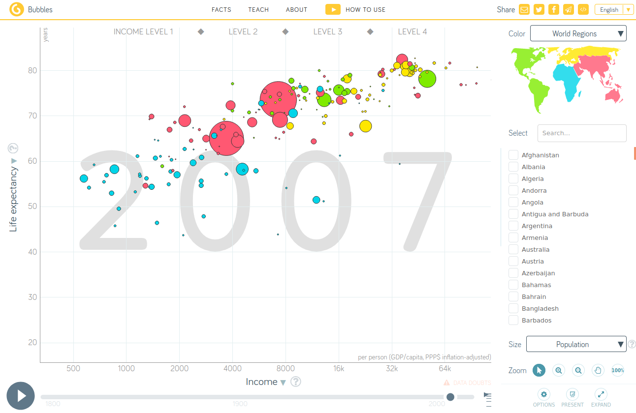 Adding muted data for each year helps regonizing where each continent