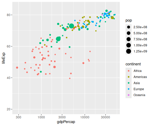 p1 <- ggplot(gm2007, aes(x = gdpPercap, y = lifeExp, color = continent)) +