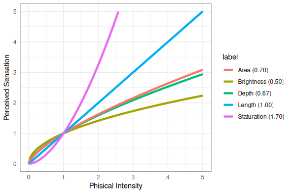 LS0tCnRpdGxlOiAiUGVyY2VwdGlvbiBhbmQgVmlzdWFsaXphdGlvbiIKb3V0cHV0OgogIGh0bWxfZG9jdW1lbnQ6CiAgICB0b2M6IHllcwogICAgY29kZV9mb2xkaW5nOiBzaG93CiAgICBjb2RlX2Rvd25sb2FkOiB0cnVlCi0tLQoKPGxpbmsgcmVsPSJzdHlsZXNoZWV0IiBocmVmPSJzdGF0NDU4MC5jc3MiIHR5cGU9InRleHQvY3NzIiAvPgoKYGBge3Igc2V0dXAsIGluY2x1ZGUgPSBGQUxTRX0Kc291cmNlKGhlcmU6OmhlcmUoInNldHVwLlIiKSkKa25pdHI6Om9wdHNfY2h1bmskc2V0KGNvbGxhcHNlID0gVFJVRSwgbWVzc2FnZSA9IEZBTFNFLAogICAgICAgICAgICAgICAgICAgICAgZmlnLmhlaWdodCA9IDUsIGZpZy53aWR0aCA9IDYsIGZpZy5hbGlnbiA9ICJjZW50ZXIiKQoKbGlicmFyeShsYXR0aWNlKQpsaWJyYXJ5KHRpZHl2ZXJzZSkKbGlicmFyeShncmlkRXh0cmEpCmxpYnJhcnkoc2NhbGVzKQpzZXQuc2VlZCgxMjM0NSkKYGBgCgoKIyMgU29tZSBSaXZlciBGbG93IERhdGEKCmBgYHtyLCBlY2hvID0gVFJVRX0Kcml2ZXIgPC0gc2NhbigiaHR0cHM6Ly93d3cuc3RhdC51aW93YS5lZHUvfmx1a2UvZGF0YS9yaXZlci5kYXQiKQpwbG90KHJpdmVyKQpgYGAKCgojIyBBIFNpbXBsZSBNb2RlbCBvZiBWaXN1YWwgUGVyY2VwdGlvbgoKVGhlIGV5ZXMgYWNxdWlyZSBhbiBpbWFnZSwgd2hpY2ggaXMgcHJvY2Vzc2VkIHRocm91Z2ggdGhyZWUgc3RhZ2VzIG9mCm1lbW9yeToKCiogSWNvbmljIG1lbW9yeTsKCiogV29ya2luZyBtZW1vcnksIG9yIHNob3J0LXRlcm0gbWVtb3J5OwoKKiBMb25nLXRlcm0gbWVtb3J5LgoKCiMjIyBJY29uaWMgTWVtb3J5CgpUaGUgZmlyc3QgcHJvY2Vzc2luZyBzdGFnZSBvZiBhbiBpbWFnZSBoYXBwZW5zIGluIGljb25pYyBtZW1vcnkuCgoqIEltYWdlcyByZW1haW4gaW4gaWNvbmljIG1lbW9yeSBmb3IgbGVzcyB0aGFuIGEgc2Vjb25kLgoKKiBQcm9jZXNzaW5nIGluIGljb25pYyBtZW1vcnkgaXMgbWFzc2l2ZWx5IHBhcmFsbGVsIGFuZCBhdXRvbWF0aWMuCgoqIFRoaXMgaXMgY2FsbGVkIF9wcmVhdHRlbnRpdmUgcHJvY2Vzc2luZ18uCgpQcmVhdHRlbnRpdmUgcHJvY2Vzc2luZyBpcyBhIGZhc3QgcmVjb2duaXRpb24gcHJvY2Vzcy4KCgojIyMgV29ya2luZyBNZW1vcnkKCk1lYW5pbmdmdWwgdmlzdWFsIGNodW5rcyBhcmUgbW92ZWQgZnJvbSBpY29uaWMgbWVtb3J5IHRvIHNob3J0IHRlcm0gbWVtb3J5LgoKVGhlc2UgY2h1bmtzIGFyZSB1c2VkIGJ5IGNvbnNjaW91cywgb3IgYXR0ZW50aXZlLCBwcm9jZXNzaW5nLgoKQXR0ZW50aXZlIHByb2Nlc3Npbmcgb2Z0ZW4gaW52b2x2ZXMgY29uc2Npb3VzIGNvbXBhcmlzb25zIG9yIHNlYXJjaC4KClNob3J0IHRlcm0gbWVtb3J5IGlzIGxpbWl0ZWQ6CgoqIGluZm9ybWF0aW9uIGlzIHJldGFpbmVkIGZvciBvbmx5IGEgZmV3IHNlY29uZHM7CgoqIG9ubHkgdGhyZWUgb3IgZm91cnMgY2h1bmtzIGNhbiBiZSBoZWxkIGF0IGEgdGltZS4KCkNodW5rcyBjYW4gYmUgb2YgdmFyeWluZyBzaXplOyBhIGNvaGVyZW50IHBhdHRlcm4gY2FuIGZvcm0gYSBzaW5nbGUKY2h1bmsgZXZlbiBpZiBpdCBpcyBxdWl0ZSBsYXJnZS4KCklmIG1vcmUgY2h1bmtzIGFyZSBuZWVkZWQgb3IgY2h1bmtzIGFyZSBuZWVkZWQgbG9uZ2VyIHRoZXkgbmVlZCB0bwpiZSByZWFjcXVpcmVkIG9yIHJldHJpZXZlZCBmcm9tIGxvbmcgdGVybSBtZW1vcnkuCgoKIyMjIExvbmcgVGVybSBNZW1vcnkKCkxvbmcgdGVybSB2aXN1YWwgbWVtb3J5IGlzIGJ1aWx0IHVwIG92ZXIgYSBsaWZldGltZSwgdGhvdWdoCmluZnJlcXVlbnRseSB1c2VkIHZpc3VhbCBjaHVua3MgbWF5IGJlY29tZSBsb3N0LgoKQ2h1bmtzIHByb2Nlc3NlZCByZXBlYXRlZGx5IGluIHdvcmtpbmcgbWVtb3J5IG1heSBiZSB0cmFuc2ZlcnJlZCB0bwpsb25nIHRlcm0gbWVtb3J5LgoKQ29tbW9uIHBhdHRlcm5zIGFuZCBjb250ZXh0dWFsIGluZm9ybWF0aW9uIGNhbiBiZSByZXRyaWV2ZWQgZnJvbQpsb25nIHRlcm0gbWVtb3J5IGZvciBhdHRlbnRpdmUgcHJvY2Vzc2luZyBpbiB3b3JraW5nIG1lbW9yeS4KCgojIyMgVmlzdWFsIERlc2lnbiBJbXBsaWNhdGlvbnMKClRyeSB0byBtYWtlIGFzIG11Y2ggdXNlIG9mIHByZWF0dGVudGl2ZSBmZWF0dXJlcyBhcyBwb3NzaWJsZS4KClJlY29nbml6ZSB3aGVuIHByZWF0dGVudGl2ZSBmZWF0dXJlcyBtaWdodCBtaXNsZWFkLgoKRm9yIGZlYXR1cmVzIHRoYXQgcmVxdWlyZSBhdHRlbnRpdmUgcHJvY2Vzc2luZyBrZWVwIGluIG1pbmQgdGhhdAp3b3JraW5nIG1lbW9yeSBpcyBsaW1pdGVkLgoKCiMjIFNvbWUgRXhhbXBsZXMgb2YgQ2hhbGxlbmdlcwoKCiMjIyBDb250ZXh0IE1hdHRlcnMKCldoaWNoIG9mIHRoZSBpbm5lciBjaXJjbGVzIGlzIGxhcmdlciwgb3IgYXJlIHRoZXkgdGhlIHNhbWUgc2l6ZT8KCjwhLS0KaHR0cDovL2p1bmtjaGFydHMudHlwZXBhZC5jb20vanVua19jaGFydHMvMjAxMi8wOS9pbnN1ZmZpY2llbmN5LWFuZC1pbGx1c2lvbnMuaHRtbAotLT4KCmBgYHtyLCBlY2hvID0gRkFMU0V9CmNpcmNsZSA8LSBsb2NhbCh7CiAgICBwaGkgPC0gc2VxKDAsIDIgKiBwaSwgbGVuZ3RoLm91dCA9IDEwMCkKICAgIHggPC0gY29zKHBoaSkKICAgIHkgPC0gc2luKHBoaSkKICAgIGZ1bmN0aW9uKGN4ID0gMCwgY3kgPSAwLCByID0gMSkgbGlzdCh4ID0gciAqIHggKyBjeCwgeSA9IHIgKiB5ICsgY3kpCn0pCnNldHVwIDwtIGZ1bmN0aW9uKHcgPSA1KQogICAgcGxvdCgwLCB0eXBlID0gIm4iLCBhc3AgPSAxLAogICAgICAgICB4bGltID0gYygtdywgdyksIHlsaW0gPSBjKC13LCB3KSwKICAgICAgICAgYXhlcyA9IEZBTFNFLCB4bGFiID0gIiIsIHlsYWIgPSAiIiwKICAgICAgICAgbWFyID0gYygwLCAwLCAwLCAwKSkKc2V0dXAoKQpwb2x5Z29uKGNpcmNsZSgtMiwgMCwgMykpCnBvbHlnb24oY2lyY2xlKC0yLCAwKSwgY29sID0gImJsYWNrIikKcG9seWdvbihjaXJjbGUoMywgMCwgMS4zKSkKcG9seWdvbihjaXJjbGUoMywgMCksIGNvbCA9ICJibGFjayIpCmBgYApgYGB7ciwgZWNobyA9IEZBTFNFfQpzZXR1cCgxMCkKeDEgPC0gLTQKeDIgPC0gNgpwb2x5Z29uKGNpcmNsZSh4MSwgMCkpCmZvciAoYSBpbiAoMiAqIHBpICogKDEgOiA2KSAvIDYpKQogICAgcG9seWdvbihjaXJjbGUoNCAqIGNvcyhhKSArIHgxLCA0ICogc2luKGEpLCAyKSkKcG9seWdvbihjaXJjbGUoeDIsIDApKQpmb3IgKGEgaW4gKDIgKiBwaSAqICgxIDogMTApIC8gMTApKQogICAgcG9seWdvbihjaXJjbGUoMS41ICogY29zKGEpICsgeDIsIDEuNSAqIHNpbihhKSwgMC41KSkKYGBgCgpXaGljaCBvZiB0aGUgbGluZXMgaXMgbG9uZ2VyLCBvciBhcmUgdGhleSB0aGUgc2FtZSBsZW5ndGg/CgpgYGB7ciwgZWNobyA9IEZBTFNFfQpzZXR1cCgpCnBvbHlnb24oY2lyY2xlKC00LCAtMikpCnBvbHlnb24oY2lyY2xlKDQsIC0yKSkKcG9seWdvbihjaXJjbGUoLTIsIDIpKQpwb2x5Z29uKGNpcmNsZSgyLCAyKSkKc2VnbWVudHMoLTMsIC0yLCAzLCAtMiwgbHdkID0gMykKc2VnbWVudHMoLTMsICsyLCAzLCArMiwgbHdkID0gMykKCndpZHRoIDwtIDMKYWggPC0gZnVuY3Rpb24oeCwgeSwgc2l6ZSA9IDEsIGRpciA9IDEpIHsKICAgIGF4IDwtIGMoLXNpemUgKiBkaXIsIDAsIC1zaXplICogZGlyKQogICAgYXkgPC0gYygtc2l6ZSwgMCwgc2l6ZSkKICAgIGxpbmVzKHggKyBheCwgeSArIGF5LCBsd2QgPSB3aWR0aCkKfQpgYGAKYGBge3IsIGVjaG8gPSBGQUxTRX0Kc2V0dXAoKQpzZWdtZW50cygtMywgLTIsIDMsIC0yLCBsd2QgPSB3aWR0aCkKYWgoMywgLTIpCmFoKC0zLCAtMiwgZGlyID0gLTEpCnNlZ21lbnRzKC0zLCArMiwgMywgKzIsIGx3ZCA9IHdpZHRoKQphaCgzLCAyLCBkaXIgPSAtMSkKYWgoLTMsIDIpCmBgYAoKVGhlIHNpbmUgSWxsdXNpb246IHdoaWNoIG9mIHRoZSBiYXJzIGFyZSBsb25nZXIsIG9yIGFyZSB0aGV5IHRoZSBzYW1lCmxlbmd0aD8KCmBgYHtyLCBjbGFzcy5zb3VyY2UgPSAiZm9sZC1oaWRlIn0KeCA8LSBzZXEoMCwgNSAqIHBpLCBsZW5ndGgub3V0ID0gMTAwKQp3IDwtIDAuNQpwbG90KHgsIHNpbih4KSwgeWxpbSA9IGMoLTEsIDEgKyB3KSwgdHlwZSA9ICJuIikKc2VnbWVudHMoeDAgPSB4LCB5MCA9IHNpbih4KSwgeTEgPSBzaW4oeCkgKyB3LCBsd2QgPSAzKQpgYGAKCjwhLS0gaHR0cDovL3ZhbnNlb2Rlc2lnbi5jb20vd2ViLWRlc2lnbi9jb2xvci1sdW1pbmFuY2UvLS0+CgpXaGljaCBvZiB0aGUgc3F1YXJlcyBBIGFuZCBCIGlzIGRhcmtlciwgb3IgYXJlIHRoZXkgdGhlIHNhbWUgc2hhZGU/CgpgYGB7ciBlY2hvID0gRkFMU0V9CmtuaXRyOjppbmNsdWRlX2dyYXBoaWNzKElNRygiY2hlc3MxLnBuZyIpKQpgYGAKYGBge3IgZWNobyA9IEZBTFNFfQprbml0cjo6aW5jbHVkZV9ncmFwaGljcyhJTUcoImNoZXNzMi5wbmciKSkKYGBgCgoKIyMjIFNvbWUgT3B0aWNhbCBJbGx1c2lvbnMKCltSIGltcGxlbWVudGF0aW9uc10oaHR0cDovL3JwdWJzLmNvbS9rb2hza2UvUi1kZS1pbGx1