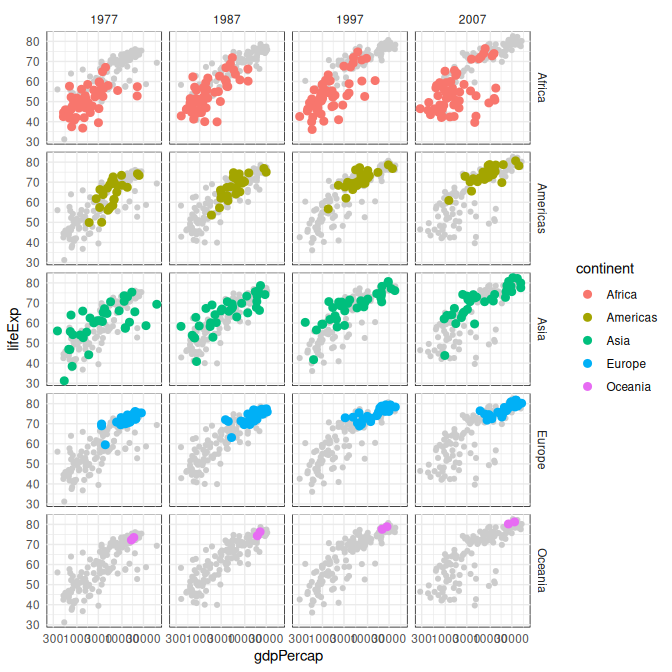 This plot shows the full data faceted by both continent and a set of