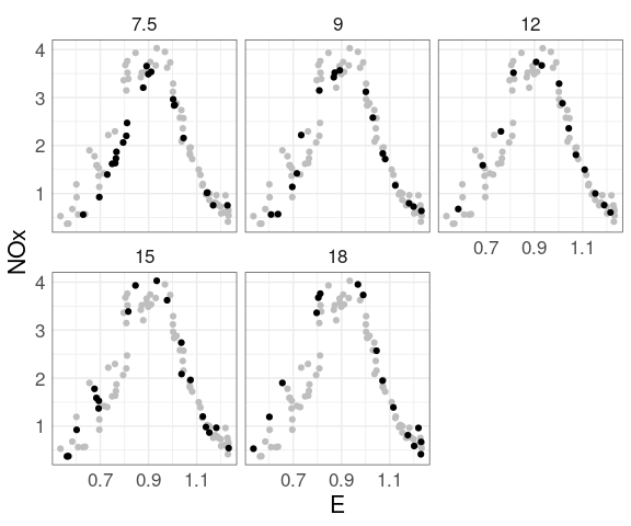The ethanol data frame in the lattice package contains data from an experiment on efficiency and emissions in small one-cylinder engines.
