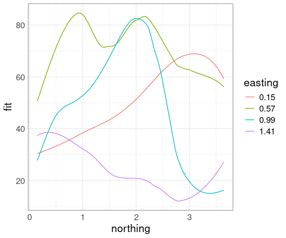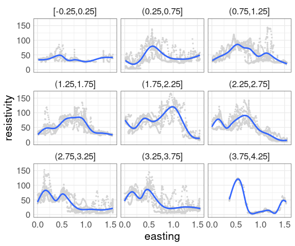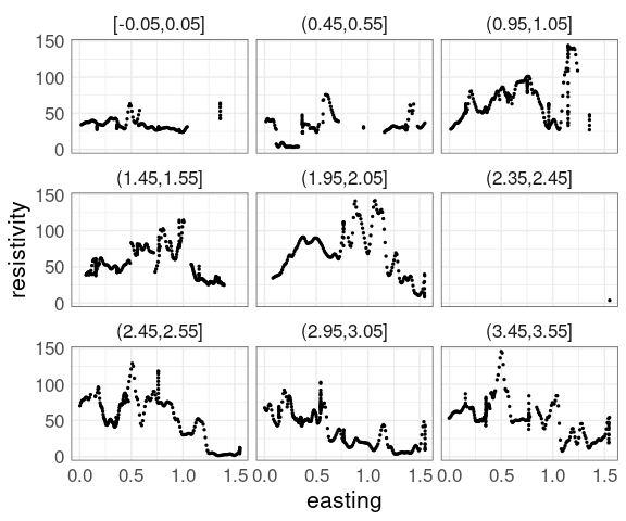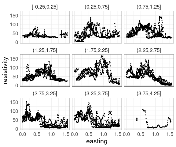 For the soil resistivity data, a coplot of resistivity against easting, conditioning on northing with bins of size 0.5: