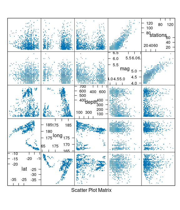 The quakes data frame contains data on locations of seismic events of magnitude 4.0 or larger in a region near Fiji.