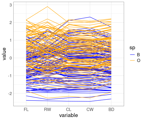 The data frame crabs in the MASS package contains measurement on crabs of a species that has been split into two based on color, orange or blue.