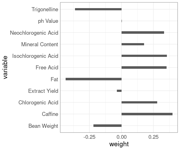 Examining the plot shows that the varieties are distinguished by their fat and caffeine contents: