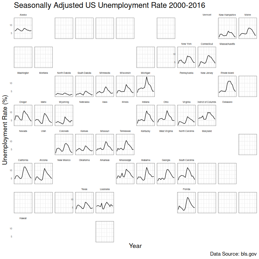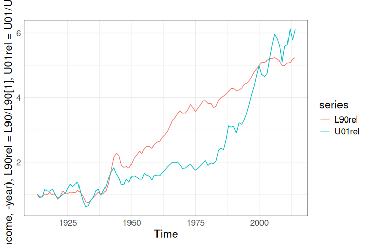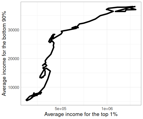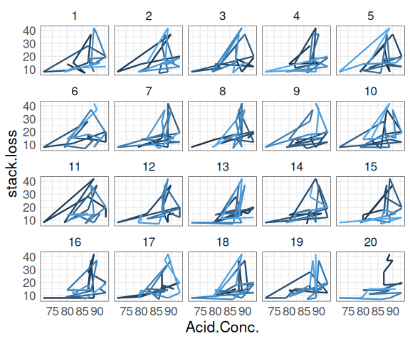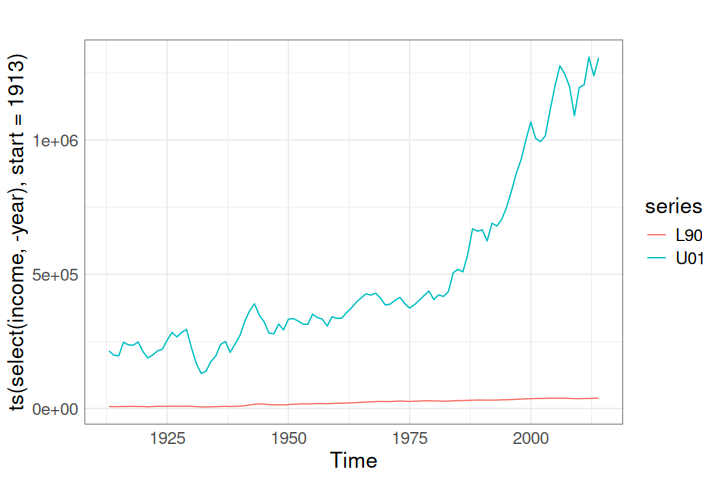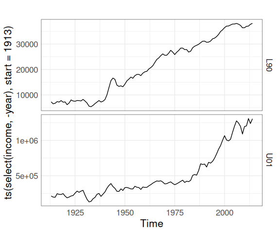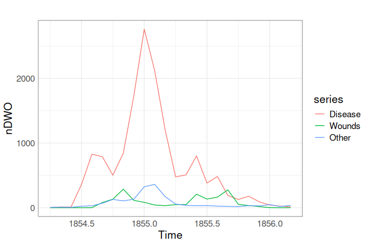 LS0tCnRpdGxlOiAiUGxvdHMgZm9yIE11bHRpcGxlIFRpbWUgU2VyaWVzIgpvdXRwdXQ6CiAgaHRtbF9kb2N1bWVudDoKICAgIHRvYzogeWVzCiAgICBjb2RlX2ZvbGRpbmc6IHNob3cKICAgIGNvZGVfZG93bmxvYWQ6IHRydWUKLS0tCgo8bGluayByZWw9InN0eWxlc2hlZXQiIGhyZWY9InN0YXQ0NTgwLmNzcyIgdHlwZT0idGV4dC9jc3MiIC8+CjxzdHlsZSB0eXBlPSJ0ZXh0L2NzcyI+IC5yZW1hcmstY29kZSB7IGZvbnQtc2l6ZTogODUlOyB9IDwvc3R5bGU+CmBgYHtyIHNldHVwLCBpbmNsdWRlID0gRkFMU0V9CnNvdXJjZShoZXJlOjpoZXJlKCJzZXR1cC5SIikpCmtuaXRyOjpvcHRzX2NodW5rJHNldChjb2xsYXBzZSA9IFRSVUUsIG1lc3NhZ2UgPSBGQUxTRSwKICAgICAgICAgICAgICAgICAgICAgIGZpZy5oZWlnaHQgPSA1LCBmaWcud2lkdGggPSA2LCBmaWcuYWxpZ24gPSAiY2VudGVyIikKCm9wdGlvbnMoaHRtbHRvb2xzLmRpci52ZXJzaW9uID0gRkFMU0UpCgpzZXQuc2VlZCgxMjM0NSkKbGlicmFyeShnZ3Bsb3QyKQpsaWJyYXJ5KGxhdHRpY2UpCmxpYnJhcnkodGlkeXZlcnNlKQpsaWJyYXJ5KGdyaWRFeHRyYSkKbGlicmFyeShmb3JlY2FzdCkKdGhlbWVfc2V0KHRoZW1lX21pbmltYWwoKSArCiAgICAgICAgICB0aGVtZSh0ZXh0ID0gZWxlbWVudF90ZXh0KHNpemUgPSAxNiksCiAgICAgICAgICAgICAgICBwYW5lbC5ib3JkZXIgPSBlbGVtZW50X3JlY3QoY29sb3IgPSAiZ3JleTMwIiwgZmlsbCA9IE5BKSkpCmBgYAoKCiMjIE11bHRpcGxlIFRpbWUgU2VyaWVzCgpTb21lIHF1ZXN0aW9ucyBmb3IgbXVsdGlwbGUgdGltZSBzZXJpZXM6CgotIEhvdyBkbyB0aGUgc2VyaWVzIGJlaGF2ZSBpbmRpdmlkdWFsbHk/CgotIEhvdyBhcmUgdGhlIHNlcmllcyByZWxhdGVkPwoKLSBEb2VzIG9uZSBzZXJpZXMgbGVhZCBvciBsYWcgdGhlIG90aGVycz8KClNvbWUgb3B0aW9ucyBmb3IgcGxvdHRpbmcgbXVsdGlwbGUgc2VyaWVzOgoKLSBzZXBhcmF0ZSBwYW5lbHMgaW4gYSB0cmVsbGlzIGRpc3BsYXk7CgotIG11bHRpcGxlIHNlcmllcyBpbiBhIHNpbmdsZSBwbG90IC0gdGhpcyB3aWxsIHJlcXVpcmUgc3RhbmRhcmRpemluZwogIGlmIHRoZSBzY2FsZXMgdmFyeSBzdWJzdGFudGlhbGx5OwoKLSBhIG11bHRpdmF0aWF0ZSBwbG90IHdpdGggdGltZSByZXByZXNlbnRlZCBieSBjb25uZWN0aW5nIGxpbmUKICBzZWdtZW50cyBvciBhbmltYXRpb24uCgpBbm90aGVyIG9wdGlvbiBmb3IgdHdvIHRpbWUgc2VyaWVzOgoKLSB1c2UgYSBzZXBhcmF0ZSBgeWAgYXhpcyBmb3IgZWFjaC4KClRoaXMgaXMgdXN1YWxseSBhIGJhZCBpZGVhLgoKU29tZSBkYXRhIHN0cnVjdHVyZXMgZm9yIG11bHRpcGxlIHRpbWUgc2VyaWVzOgoKKiBgbXRzYCBvYmplY3RzIGNyZWF0ZWQgYnkgYHRzKClgLgoKICAgIC0gQWxsIHNlcmllcyBoYXZlIHRvIGJlIG51bWVyaWMuCiAgICAtIGBhdXRvcGxvdGAgbWV0aG9kcyBtYXkgYmUgc3VmZmljaWVudC4KCiogUmVndWxhciBkYXRhIGZyYW1lcy4KCiAgICAtIFRoZSBzZXJpZXMgd2lsbCBoYXZlIHRvIGJlIHBsb3R0ZWQgaW4gc2VwYXJhdGUgbGF5ZXJzLAogICAgLSBvciB0aGUgZGF0YSBmcmFtZXMgd2lsbCBuZWVkIGNvbnZlcnRpbmcgaW50byBsb25nIGZvcm0uCgoKIyMgQ3JpbWVhbiBXYXIgQ2FzdWFsdGllcwoKVGhlIGBIaXN0RGF0YWAgcGFja2FnZSBjb250YWlucyB0aGUgZGF0YSB1c2VkIGJ5IEZsb3JlbmNlIE5pZ2h0aW5nYWxlCnRvIGNhbGwgYXR0ZW50aW9uIHRvIHRlcnJpYmxlIHNhbml0YXJ5IGNvbmRpdGlvbnMgZm9yIHRoZSBCcml0aWNoIGFybXkKaW4gQ3JpbWVhLgoKYGBge3J9CmRhdGEoTmlnaHRpbmdhbGUsIHBhY2thZ2UgPSAiSGlzdERhdGEiKQpoZWFkKHNlbGVjdChOaWdodGluZ2FsZSwgLURhdGUpKQpgYGAKCkEgcGxvdCBvZiB0aGUgYERpc2Vhc2VgLCBgV291bmRzYCwgYW5kIGBPdGhlcmA6CgpgYGB7ciBuaWdodC10cy1hdXRvLCBlY2hvID0gRkFMU0UsIGZpZy53aWR0aCA9IDcuNX0KbkRXTyA8LSBzZWxlY3QoTmlnaHRpbmdhbGUsCiAgICAgICAgICAgICAgIERpc2Vhc2UsIFdvdW5kcywgT3RoZXIpIHw+CiAgICB0cyhzdGFydCA9IGMoMTg1NCwgNCksIGZyZXF1ZW5jeSA9IDEyKQoKYXV0b3Bsb3QobkRXTykKYGBgCmBgYHtyIG5pZ2h0LXRzLWF1dG8sIGV2YWwgPSBGQUxTRX0KYGBgCgpVc2luZyB0aGUgcmF0ZSB2YXJpYWJsZXMgcHJvZHVjZXMgYSB2ZXJ5IHNpbWlsYXIgcGF0dGVybjoKCmBgYHtyIG5pZ2h0LXJhdGUtdHMtYXV0bywgZWNobyA9IEZBTFNFLCBmaWcud2lkdGggPSA3LjV9Cm5EV08ucmF0ZSA8LSBzZWxlY3QoTmlnaHRpbmdhbGUsCiAgICAgICAgICAgICAgICAgICAgZW5kc193aXRoKCJyYXRlIikpIHw+CiAgICB0cyhzdGFydCA9IGMoMTg1NCwgNCksIGZyZXF1ZW5jeSA9IDEyKQoKYXV0b3Bsb3QobkRXTy5yYXRlKQpgYGAKYGBge3IgbmlnaHQtcmF0ZS10cy1hdXRvLCBldmFsID0gRkFMU0V9CmBgYAoKVGhlIGFybXkgc2l6ZSBkb2VzIG5vdCB2YXJ5IGVub3VnaCBvdmVyIHRoZSB0aW1lIHdoZXJlIHRoZSBjYXN1YWx0aWVzCmFyZSBoaWdoIHRvIGFmZmVjdCB0aGUgcGF0dGVybiBtdWNoOgoKYGBge3IgbmlnaHQtYXJteS10cy1hdXRvLCBlY2hvID0gRkFMU0V9Cm5Bcm15IDwtIHNlbGVjdChOaWdodGluZ2FsZSwgQXJteSkgfD4KICAgIHRzKHN0YXJ0ID0gYygxODU0LCA0KSwgZnJlcXVlbmN5ID0gMTIpCgphdXRvcGxvdChuQXJteSkKYGBgCmBgYHtyIG5pZ2h0LWFybXktdHMtYXV0bywgZXZhbCA9IEZBTFNFfQpgYGAKCkluc3RlYWQgb2Ygc2hvd2luZyB0aHJlZSBzZXJpZXMgaW4gb25lIHBsb3QgeW91IGNhbiBhbHNvIHVzZSBmYWNldGluZy4KCmBgYHtyIG5pZ2h0LWF1dG8tZmFjZXQsIGVjaG8gPSBGQUxTRX0KYXV0b3Bsb3QobkRXTywgZmFjZXRzID0gVFJVRSkKYGBgCmBgYHtyIG5pZ2h0LWF1dG8tZmFjZXQsIGV2YWwgPSBGQUxTRX0KYGBgCgpUbyBjcmVhdGUgdGhlIHBsb3Qgb2YgYERpc2Vhc2VgLCBgV291bmRzYCwgYW5kIGBPdGhlcmAgdXNpbmcgYmFzaWMKYGdncGxvdGAgaXQgaXMgYmVzdCB0byBmaXJzdCBjb252ZXJ0IHRoZSBkYXRhIGludG8gbG9uZyBmb3JtLgoKWW91IGNhbiBjcmVhdGUgYSBsb25nIHZlcnNpb24gb2YgdGhlIGRhdGEsIHVzaW5nIGVpdGhlciBgcGl2b3RfbG9uZ2VyYApvciBgYnJvb206OnRpZHlgLgoKVXNpbmcgYGJyb29tOnRpZHlgIG9uIHRoZSBgbXRzYCBvYmplY3Q6CgpgYGB7ciBuaWdodC1nZ3Bsb3QtYnJvb20sIGVjaG8gPSBGQUxTRSwgZmlnLndpZHRoID0gNy41fQpicm9vbTo6dGlkeShuRFdPKSB8PgogICAgcmVuYW1lKERhdGUgPSBpbmRleCwKICAgICAgICAgICBEZWF0aHMgPSB2YWx1ZSwKICAgICAgICAgICBDYXVzZSA9IHNlcmllcykgfD4KICAgIGdncGxvdChhZXMoeCA9IERhdGUsCiAgICAgICAgICAgICAgIHkgPSBEZWF0aHMsCiAgICAgICAgICAgICAgIGNvbG9yID0gQ2F1c2UpKSArCiAgICBnZW9tX2xpbmUoKQpgYGAKYGBge3IgbmlnaHQtZ2dwbG90LWJyb29tLCBldmFsID0gRkFMU0V9CmBgYAoKVXNpbmcgYHBpdm90X2xvbmdlcmAgb24gdGhlIG9yaWdpbmFsIGRhdGEgZnJhbWU6CgpgYGB7ciBuaWdodC1nZ3Bsb3QtcGl2b3QtbG9uZ2VyLCBlY2hvID0gRkFMU0UsIGZpZy53aWR0aCA9IDcuNX0Kc2VsZWN0KE5pZ2h0aW5nYWxlLAogICAgICAgRGF0ZSwgRGlzZWFzZSwgV291bmRzLCBPdGhlcikgfD4KICAgIHBpdm90X2xvbmdlcigtRGF0ZSwKICAgICAgICAgICAgICAgICBuYW1lc190byA9ICJDYXVzZSIsCiAgICAgICAgICAgICAgICAgdmFsdWVzX3RvID0gIkRlYXRocyIpIHw+CiAgICBnZ3Bsb3QoYWVzKHggPSBEYXRlLAogICAgICAgICAgICAgICB5ID0gRGVhdGhzLAogICAgICAgICAgICAgICBjb2xvciA9IENhdXNlKSkgKwogICAgZ2VvbV9saW5lKCkKYGBgCmBgYHtyIG5pZ2h0LWdncGxvdC1waXZvdC1sb25nZXIsIGV2YWwgPSBGQUxTRX0KYGBgCgpVc2luZyBmYWNldGluZyBpbnN0ZWFkIG9mIGEgc2luZ2xlIHBsb3Q6CgpgYGB7ciBuaWdodC1nZ3Bsb3QtZmFjZXQsIGVjaG8gPSBGQUxTRX0Kc2VsZWN0KE5pZ2h0aW5nYWxlLAogICAgICAgRGF0ZSwgRGlzZWFzZSwgV291bmRzLCBPdGhlcikgfD4KICAgIHBpdm90X2xvbmdlcigtRGF0ZSwKICAgICAgICAgICAgICAgICBuYW1lc190byA9ICJDYXVzZSIsCiAgICAgICAgICAgICAgICAgdmFsdWVzX3RvID0gIkRlYXRocyIpIHw+CiAgICBnZ3Bsb3QoYWVzKHggPSBEYXRlLCB5ID0gRGVhdGhzKSkgKwogICAgZ2VvbV9saW5lKCkgKwogICAgZmFjZXRfd3JhcCh+IENhdXNlLCBuY29sID0gMSkKYGBgCmBgYHtyIG5pZ2h0LWdncGxvdC1mYWNldCwgZXZhbCA9IEZBTFNFfQpgYGAKClRvIGZvY3VzIG9uIHRoZSBzaGFwZSBvZiB0aGUgY3VydmVzIGl0IGlzIG9mdGVuIHVzZWZ1bCB0byBhbGxvdyB0aGUKdmVydGljYWwgYXhpcyByYW5nZXMgdG8gYWRqdXN0IHRvIHRoZSBkYXRhOgoKYGBge3IgbmlnaHQtZ2dwbG90LWZhY2V0LWZyZWUteSwg