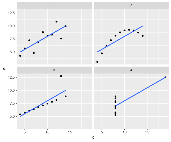 Another set of examples in the same spirit is provided by the package datasauRus ; the package vignette shows the examples.